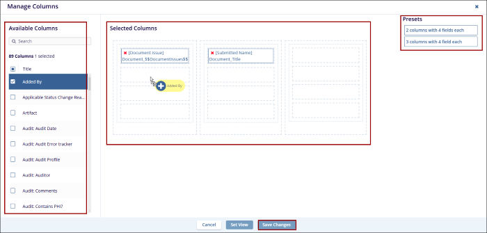 - To add a column to the Selected Columns pane from the Available Columns pane, drag & drop a column within the selected preset in the Selected Columns panel.
