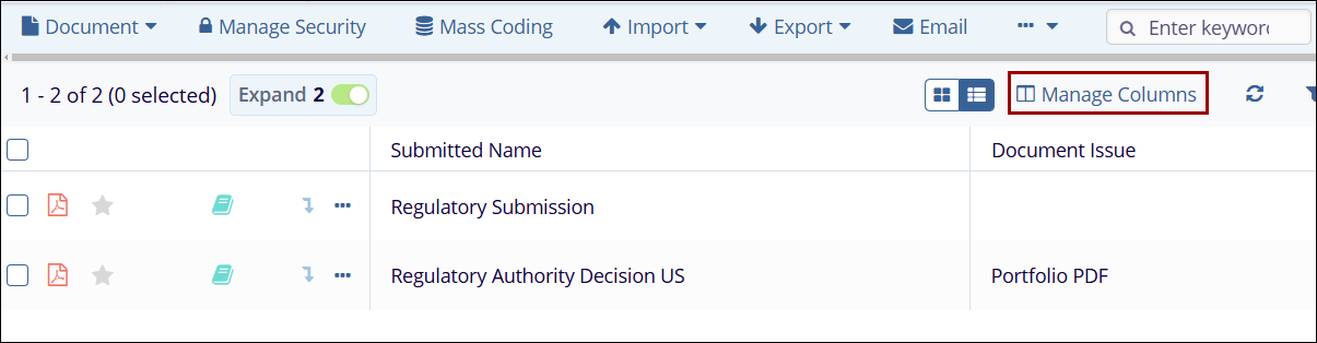 - Click the Manage Columns button from the top-right corner of the documents grid.