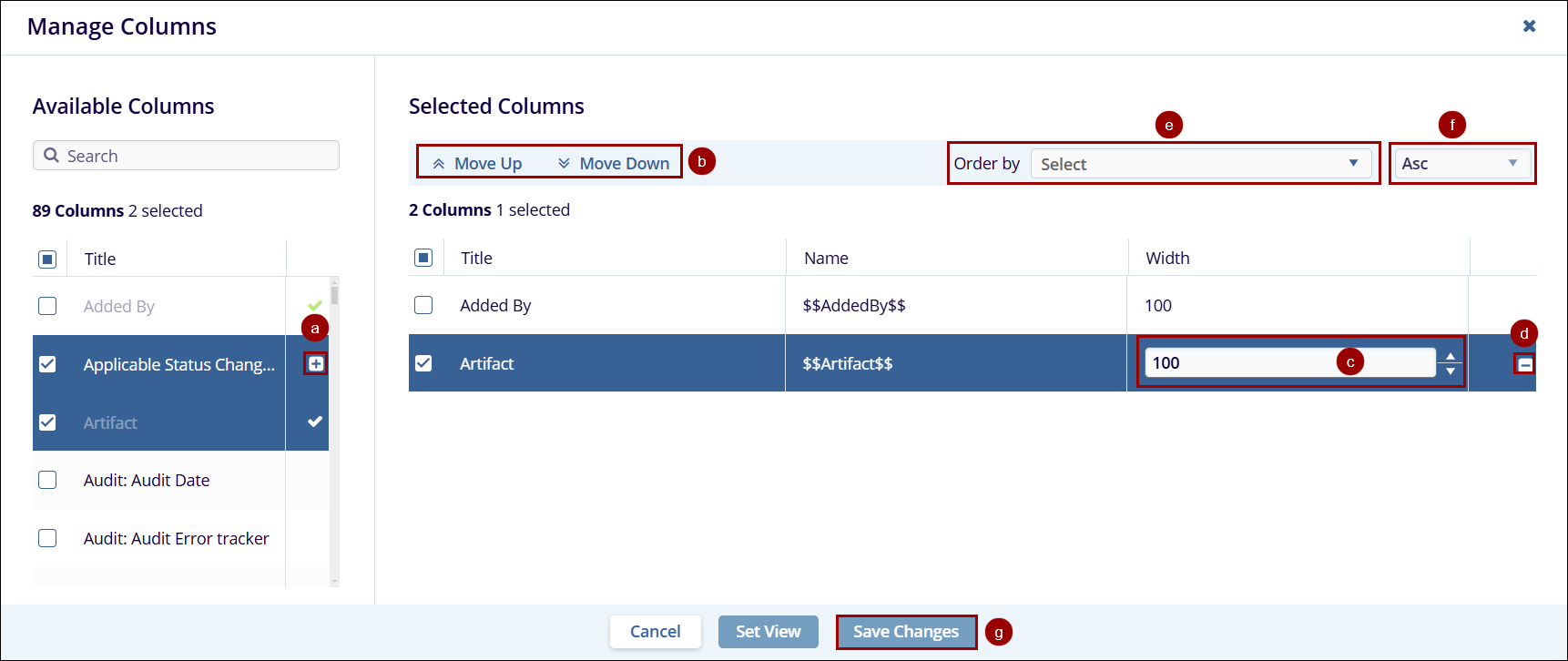 - In the Selected Columns section, select a column and click on the Move Up and Move Down arrows to re-arrange the order of the columns.