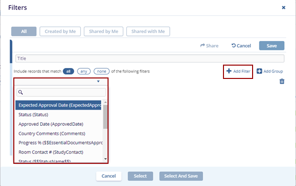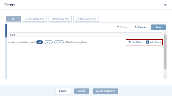 - Click the +Add Filter option. The empty field populates on the page.
