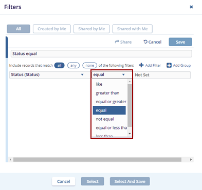 other fields such as Equal and Not Set will be populated accordingly.