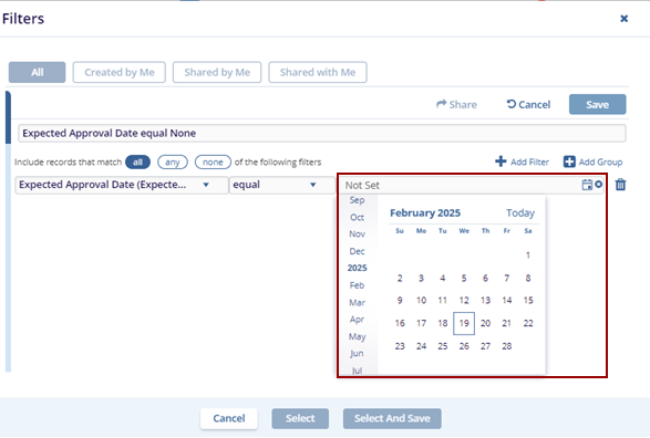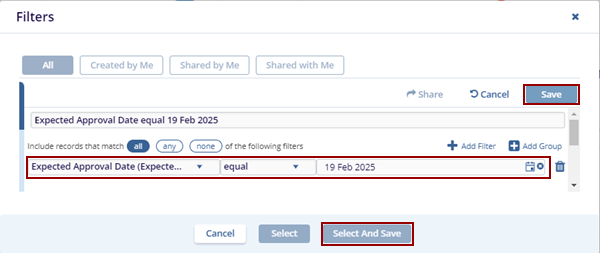 - Configure the filter criteria and click the Save button on the top right side of the Filters pop-up window.
