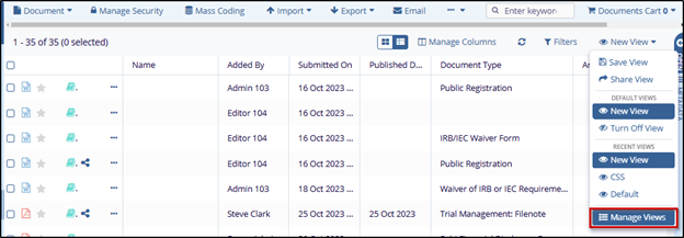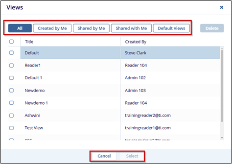 - To delete a view, select a view from the list and click the Delete button at the top right corner of the window.