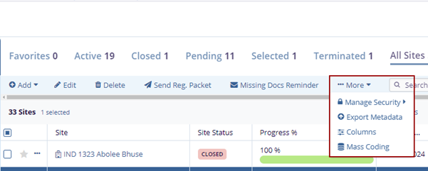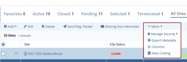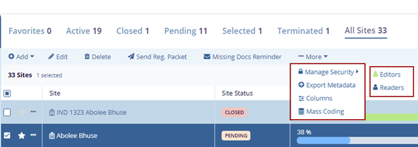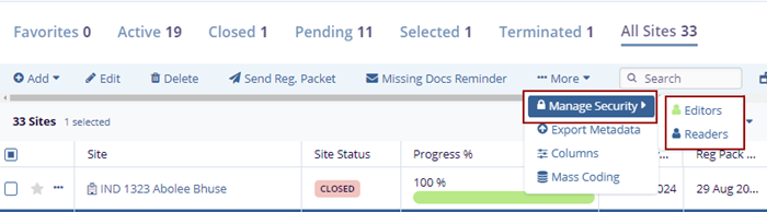 1. Select a site by clicking on the checkbox and click the More dropdown button and select Manage Security option.