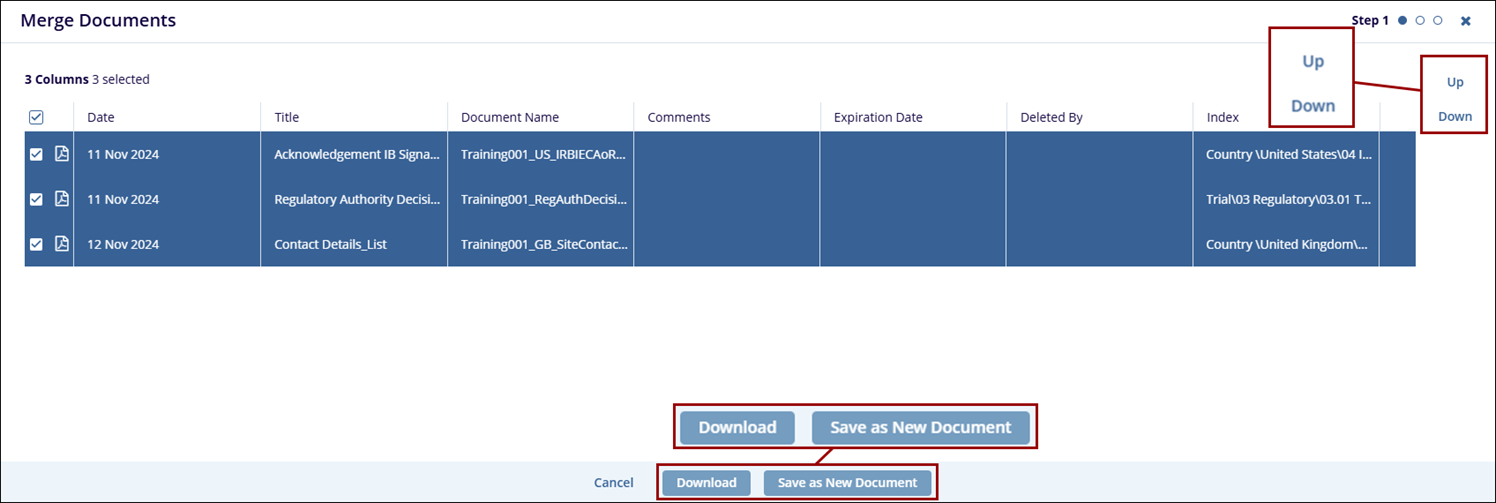 - On the Merge Documents screen, access the Up and Down buttons on the right side to rearrange the order of documents in the correct order of appearance in the final document.
