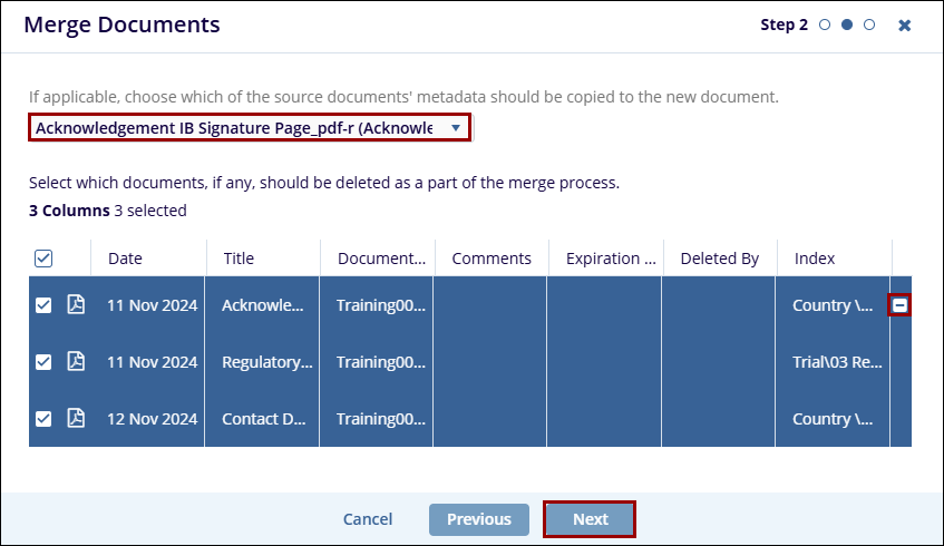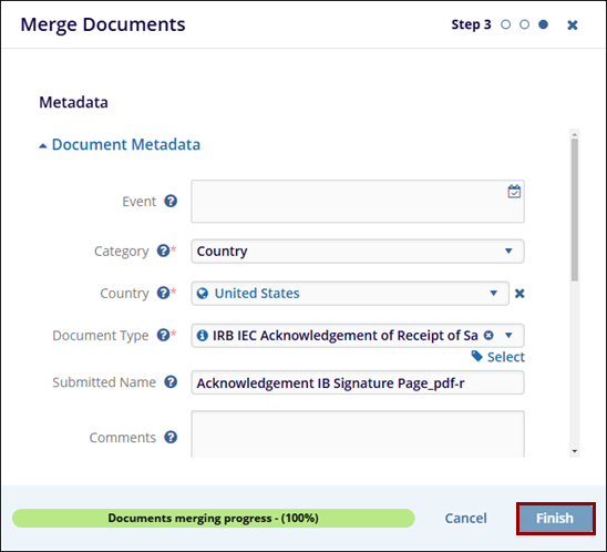 - On the Merge Documents screen, confirm the metadata for the merged document and
