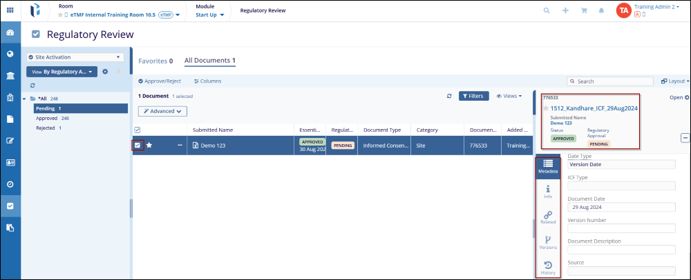 1. Select a document by clicking on the checkbox and the Metadata Panel on the right-hand side will open, displaying detailed information about the selected document.