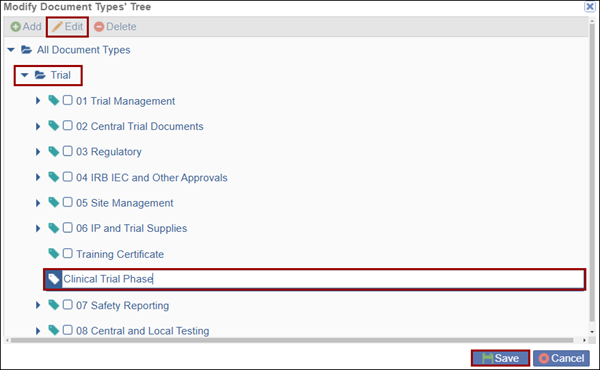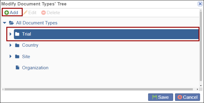 - On the Modify Document Types’ Tree window, select a folder and click on the