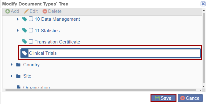 On the Modify Document Types’ Tree window expand the category folder where the new document type was added.