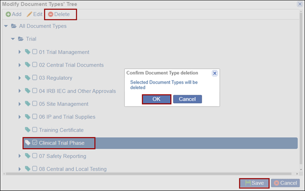 - Confirm the document type deletion by clicking on the OK button on the confirmation popup.