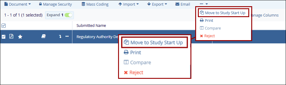 - Click on the three-dot menu and select the Move to Study Start Up option.