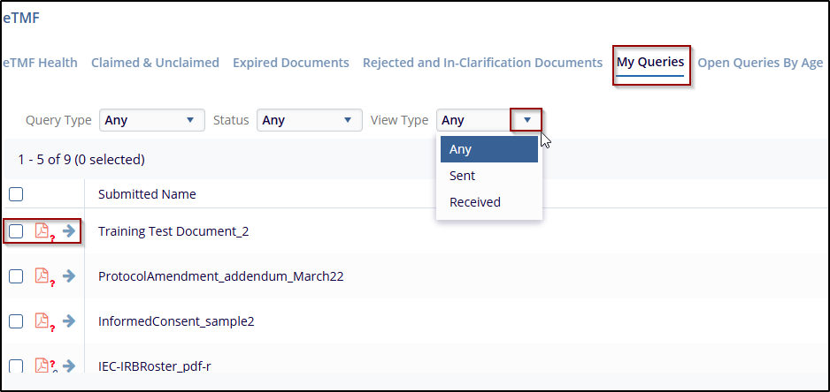 My Queries in the eTMF allows the users to view and manage queries related to the documents they are working on. Queries could be either sent (by the user to someone else) or received (from others to the user). This helps to track the status of queries and allows the user to take actions such as responding to or exporting query details.