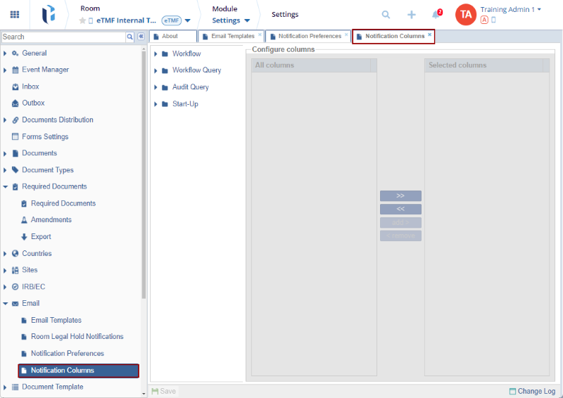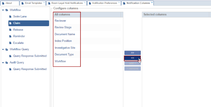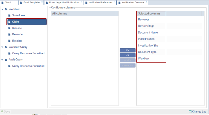 The Notification Columns are related to the list of fields that will be included in notification emails for notifications that the user wants to receive.