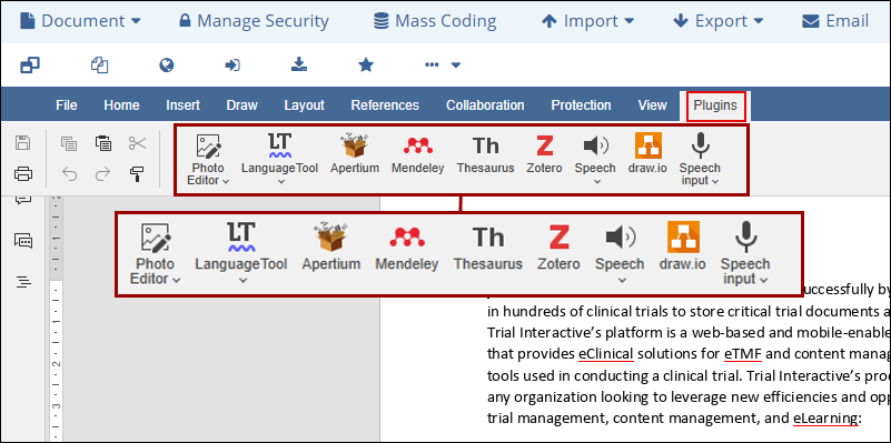 Note: To access the plugins, check out a document for online editing and navigate to the Plugins menu in the toolbar at the top of the document viewer while in editing mode.