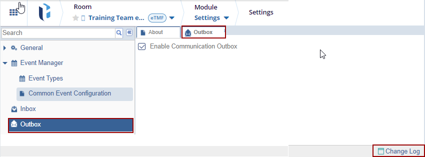 The Change Log option, located at the bottom right of the screen, displays a record of Outbox. It includes columns for Item Name, New Value, Old Value, Updated By, and Updated On (with the timestamp) and Close button.
