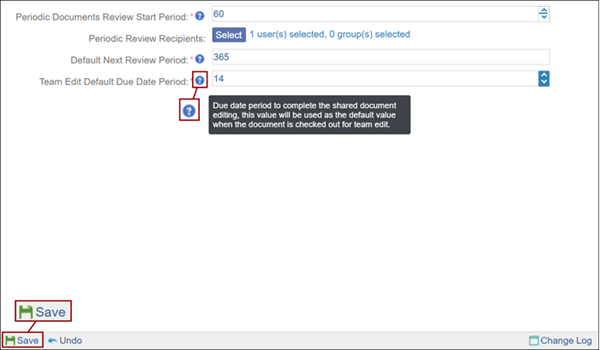 - Team Edit Default Next Review Period: This is the due date period to complete the shared document editing. The value mentioned in this field will be the default value when the document is checked out for team edit.