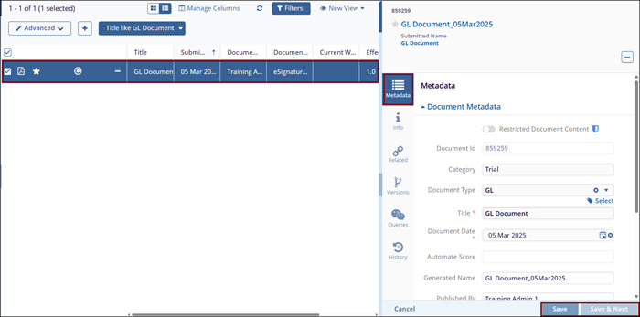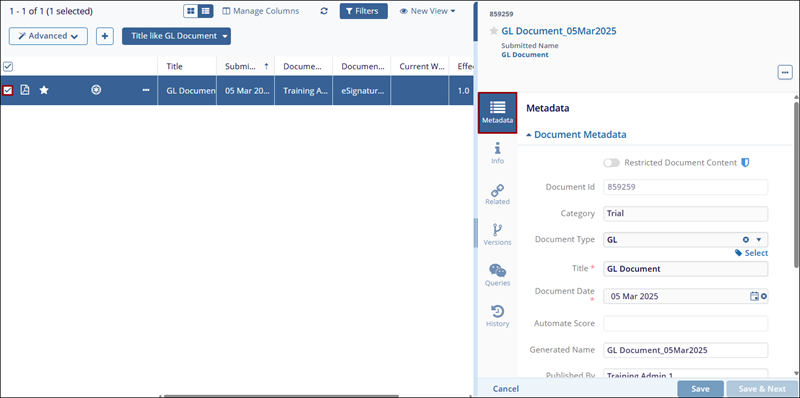The Document Metadata panel allows users to view the document metadata and the document in separate panels in the Collaborative Workspace/Document’s Library module.