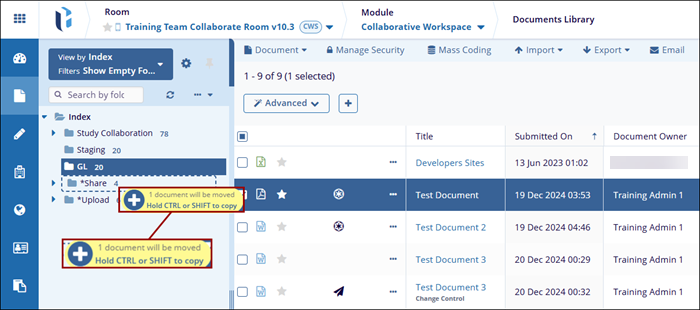 Users with necessary access permissions can drag and drop documents from one folder to another. Dragging and dropping documents across folders will not alter the metadata applied to the document. However, if a document manually copied from one folder to another, users need to re-code the document.
