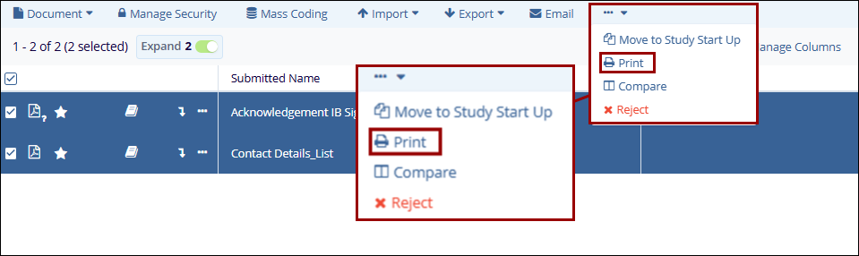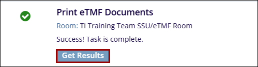 - On the Print eTMF Documents success message popup, click on the Get Results button and a