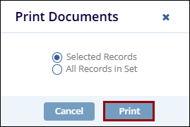- On the Print Documents popup select either Selected Records or All Records in Set radio button and click on the Print button.