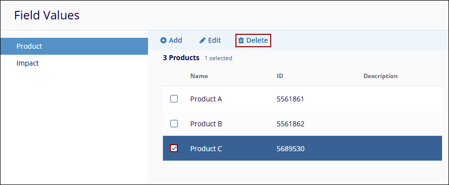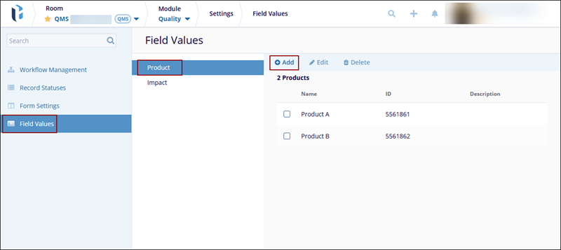 The ‘Products’ tab allows Admin users to configure a list of products that the Originator or Record Creator users define in the Incident, Action Item, and CAPA forms.