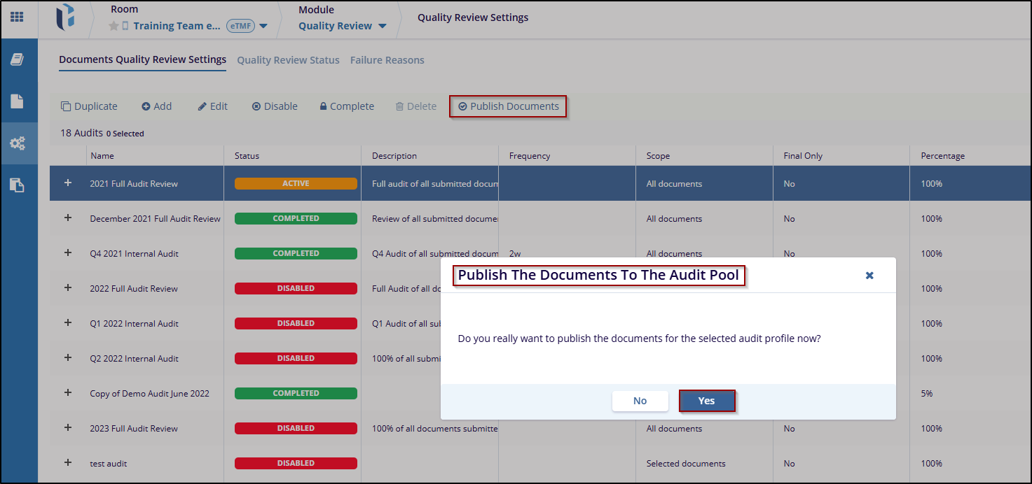 The user may need to deactivate and reactivate an audit profile in a study room. If the audit is reactivated and new documents need to be added, select the audit and click the Publish Documents button.