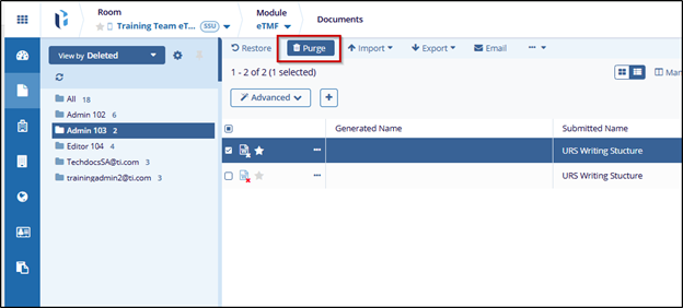 Once a document has been deleted, an administrator-level user will be able to navigate to the Deleted Documents view of the Documents module and, if desired, purge the document. Most deleted documents do not need to be purged from a study room unless necessitated by an internal SOP. However, some documents, such as those that contain PHI or PII, would likely be purged out of an abundance of caution.