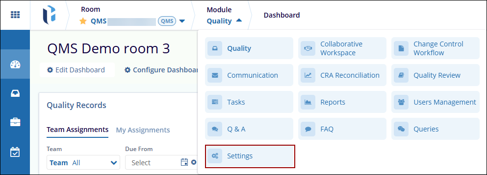 - Click on the ‘Modules’ dropdown and select the Settings module.