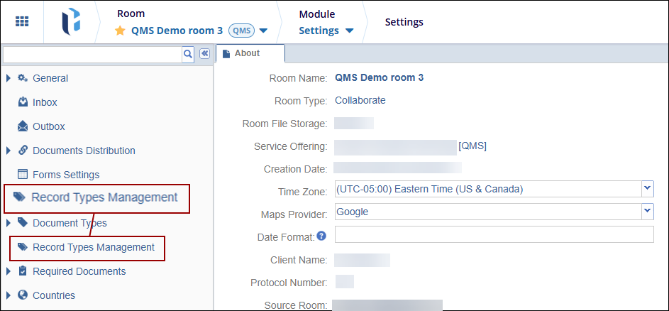 The Record Type Management in the Room Settings allows Admin users to enable the creation, management, and configuration of record types. The Record Types Management settings page displays a structured interface to manage record types and their associated forms, workflows, and field settings. Record types are displayed in a tree structure, categorized by pre-defined categories based on forms with the ‘main topic’ type.