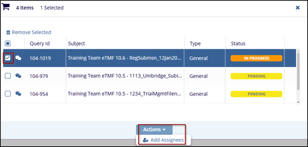 added to it and queries are listed with a Query ID, Subject, Type, and Status.
