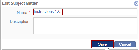 - Type the name of the Subject matter category in the Name field. The Name field is required; the Description field is optional.
