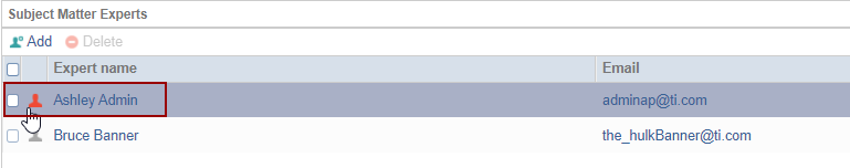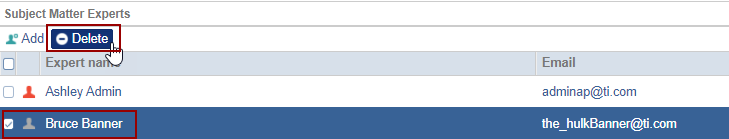 - Select the checkbox next to the name(s) of the Subject Matter Expert you want to delete and click Delete from the toolbar.