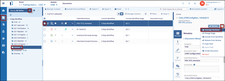 - Locate the document which needs to be reassigned. If necessary, expand the metadata pane.