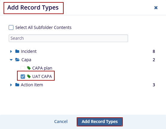 Note: To select all subfolder contents at once from the chosen category, the user must check the Select All Subfolder Contents checkbox in the Add Record Types pop-up window.