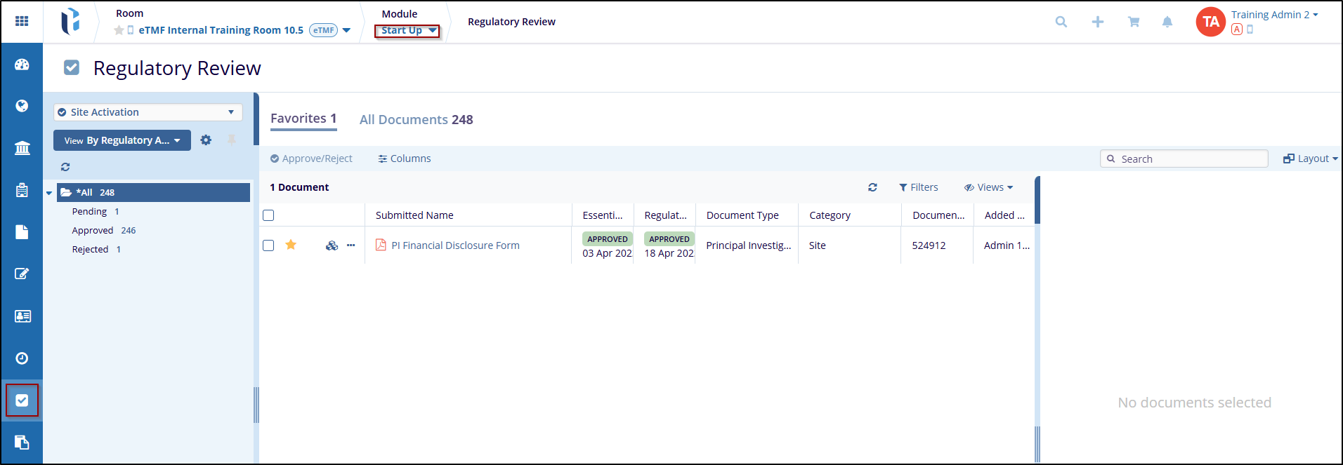 The Regulatory Review module allows users to view the review statuses of documents submitted for regulatory review, as well as review and approve the documents. The procedure for approving documents by the regulatory reviewer is discussed after a summary of the dashboard.