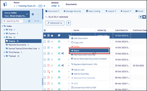 A new setting is added to support a Rejected folder within the eTMF for Room Administrators, and a new Document Rejection function is now available to Admins, Document Managers, and Room Managers. Any documents in Upload, Inbox, Staging, and Rejected Folders are not considered to be Final. A Reason for Rejection dropdown is now available for workflow documents and documents in the rejected folder/status are now excluded from eTMF health calculations.