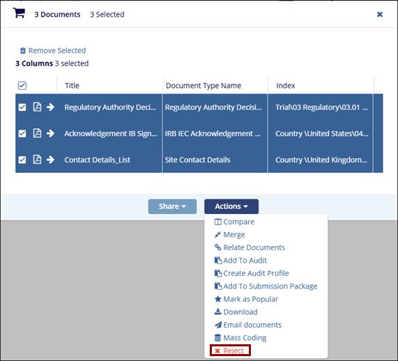 - On the Documents Cart window, click on the Actions dropdown and select the Reject option.