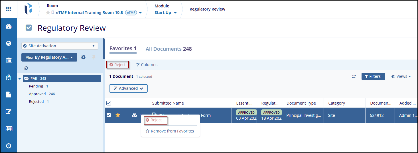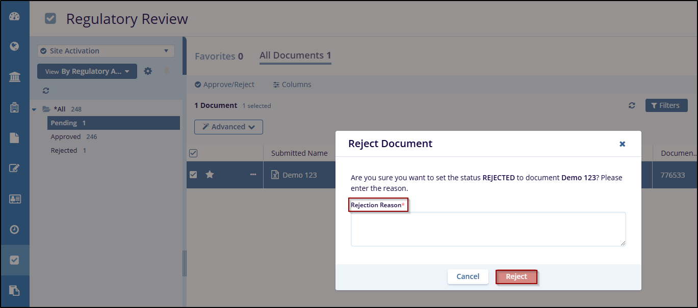 - Select a document by clicking on the checkbox and the Reject Button will be available at the Top menu bar.