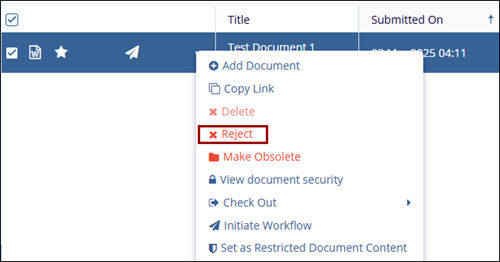 - Right-click on the document or the three-dot menu in the grid and select the Reject