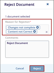 - Provide a rejection reason on the Reject Document popup and click on the Reject