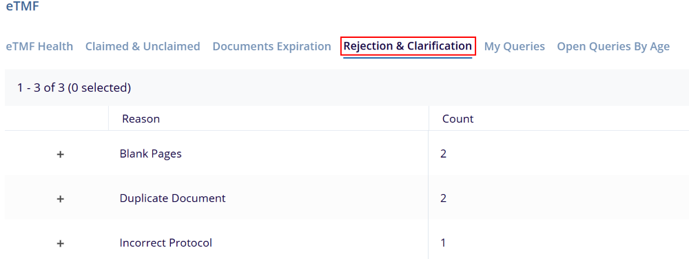 - Navigate to the eTMF dashboard, and select the Expired Document tab to view the list of documents associated with a specific rejection or clarification reason.