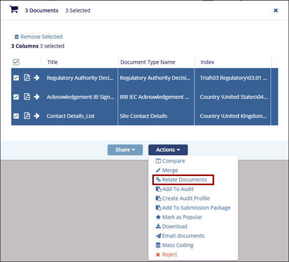 - On the Documents Cart window, click on the Actions dropdown and select the Related