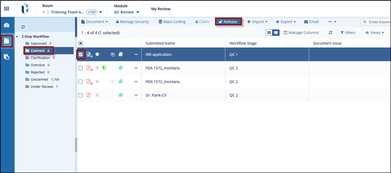- Check the checkbox to indicate which documents should be released.