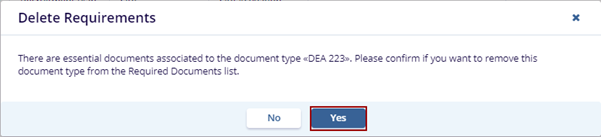 - Click the Remove button, the Delete Requirements pop-up window with the No and Yes buttons.