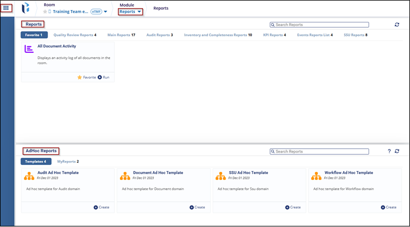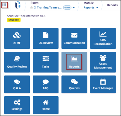 The Reports module provides activities and document actions, offering a summary of the reports. Users can access this module from the navigation grid in the upper-left corner of the screen, where the Report module is listed.