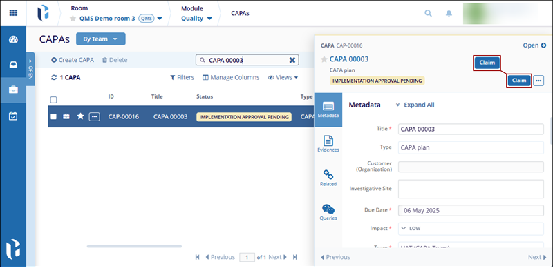 - As the authority in the Implementation stage, open the CAPA record and navigate to the