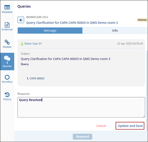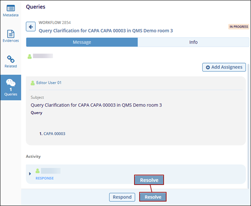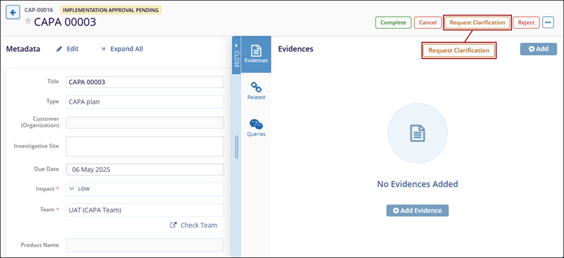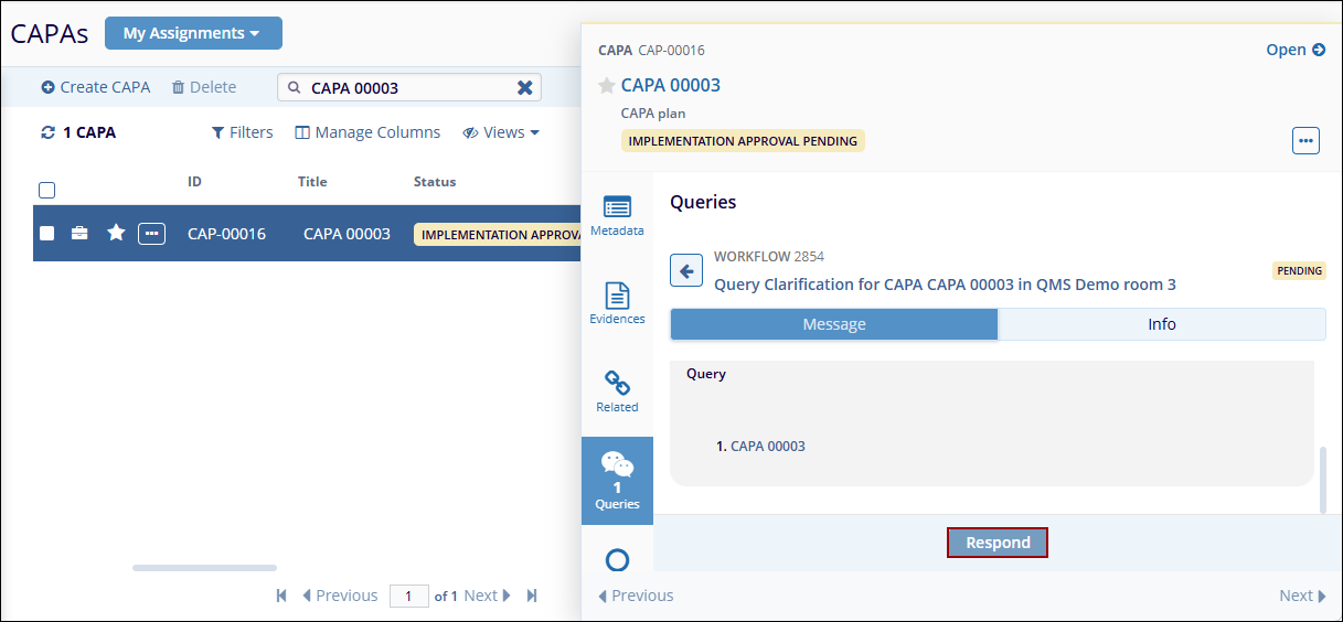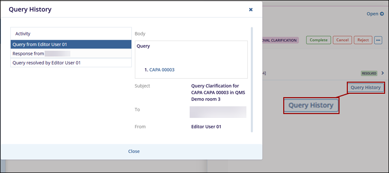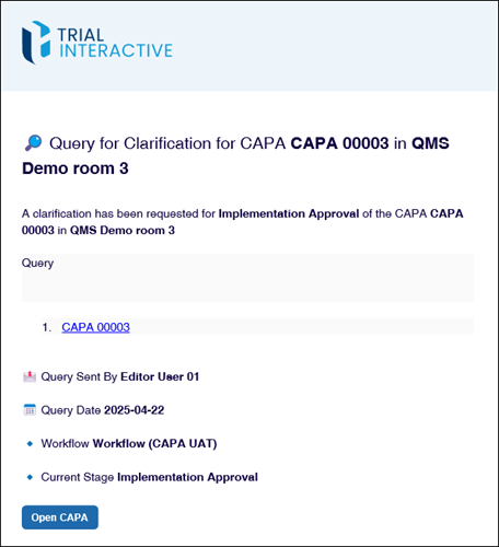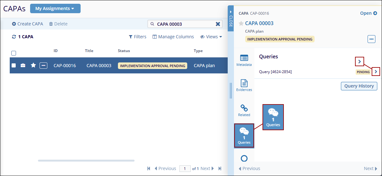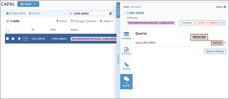 When a CAPA record progresses through the workflow stages, the assigned authorities at each stage can request clarification or create a query for the CAPA record, based on the workflow stage configuration.