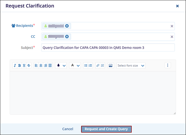 - On the Request Clarification screen, mandatorily specify the recipients, add a