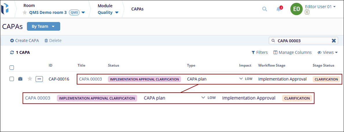 - Create a CAPA record as an originator user and send it to the first stage of the approval workflow by following the steps detailed in the Create CAPA section.