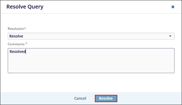 - On the Resolve Query modal window, mandatorily enter comments and click on the